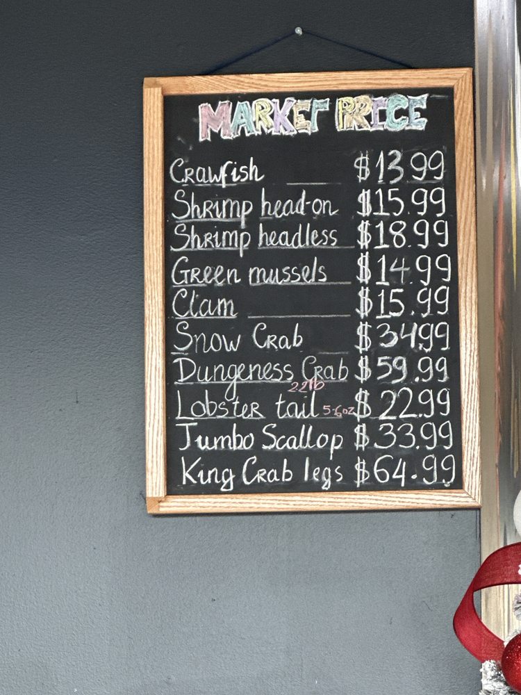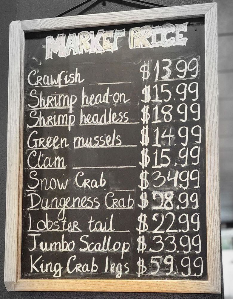 Free chicken wing or basket. 1 lobster tail, 1 lb king crab, 1 lb snow crab, 1 lb crawfish, 1 lb shrimp (head-on), 1 lb clam, 1 lb green mussels, 1/2 lb scallop, corn (6pcs), potato (6pcs), sausage (6pcs), 2 boiled eggs and free 6 wings or 1 basket.
